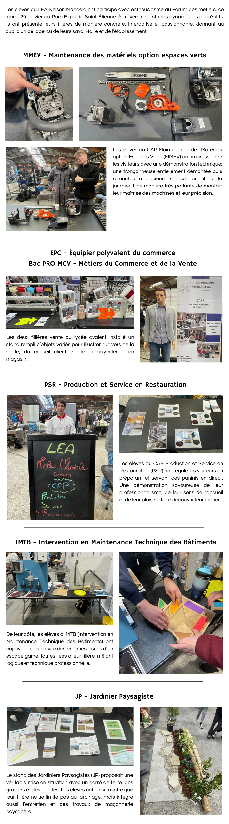 Mardi 20 janvier, les élèves du LEA Nelson Mandela ont participé au Forum des métiers. Ils ont présenté leur filière à travers cinq stands créatifs. Un forum réussi, à l’image de nos élèves : engagés, inventifs et fiers de leur formation !