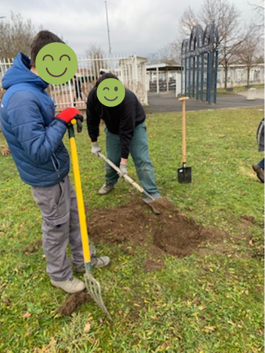 Le vendredi 14 février 2025, quatre élèves en deuxième année CAP Jardinier Paysagiste ont planté 7 arbres au Lycée Professionnel Pierre Desgranges, à Andrézieux Bouthéon.