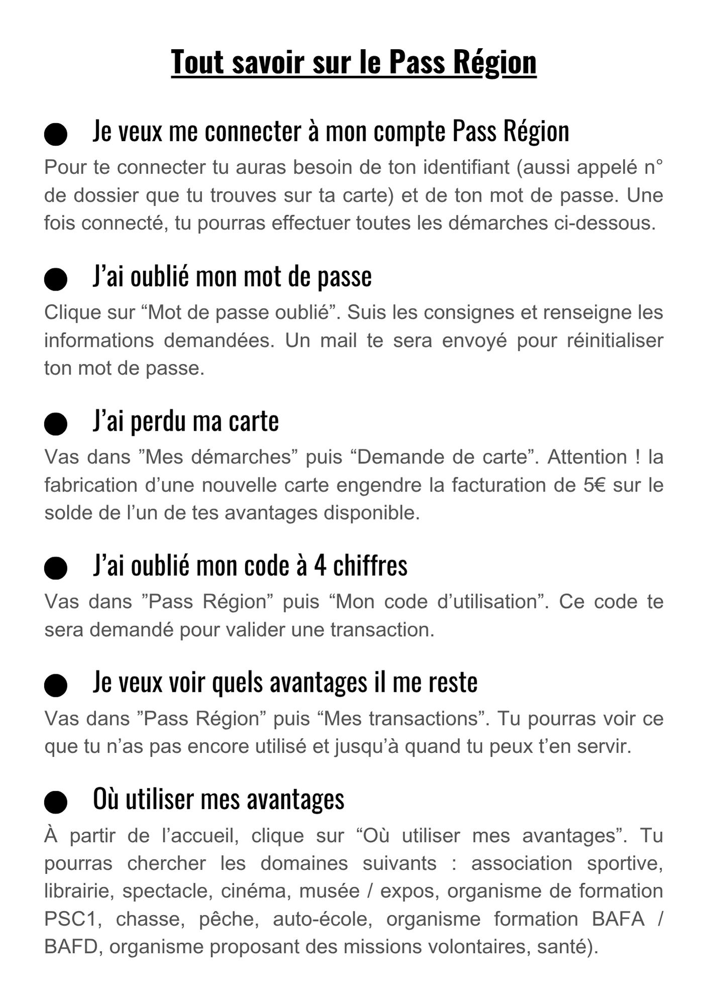 - Pour se connecter à son compte Pass Région (pour voir les avantages qu'il reste sur sa carte, trouver des endroits où utiliser ses avantages, modifier son mot de passe ou son code à 4 chiffres) :